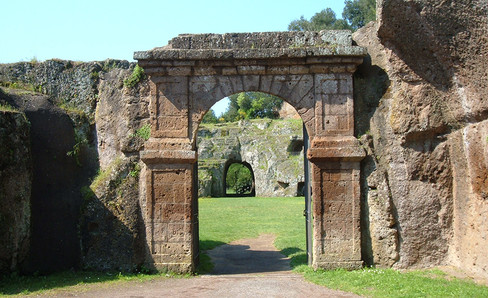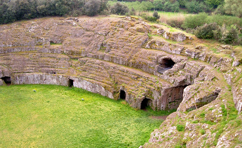 This amphitheater was entirely dug into rock, using the same method as the one used in quarries to extract blocks of stone. The hill was cut up block by block. There are no underground rooms or carceres (starting gates). Although it has no masonry parts, this monument is the exact replica of a built amphitheater.