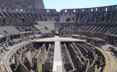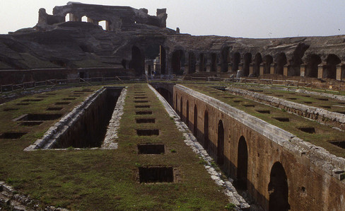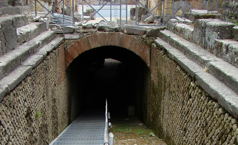 The two level large underground rooms of this amphitheater are completely preserved. Accessible by ramps at each of the ends of its long axis, it features 48 cages for animals attached to as many hoists for which we have rediscovered the operating principles.