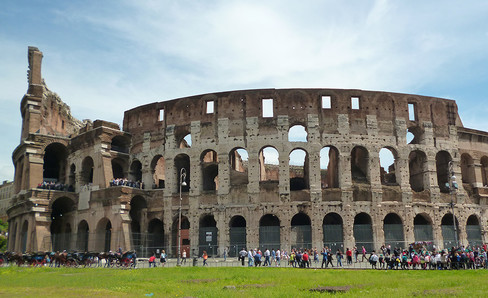 The Colosseum, whose name is derived from the colossal golden statue of Nero that was near it, is the largest amphitheater of the Roman world. Its façade features three levels of arcades plus a top crown or attic level, each of which is decorated with engaged columns and pilasters. Its construction was not completed until 90 CE. This edifice was in a district entirely used for the games (gladiators barracks, hospital, armory…).