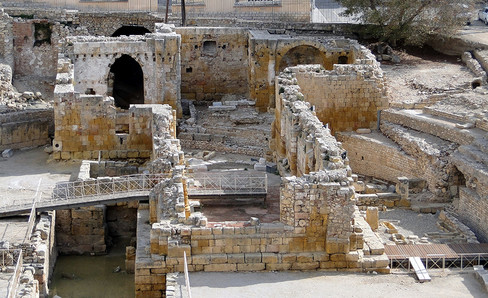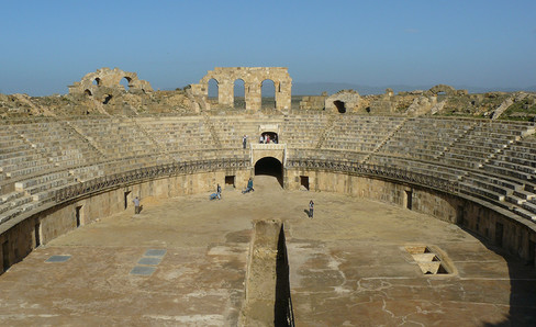 The internal structure of this amphitheater and the seating, which was made of wood, have disappeared. All that remains is its magnificent façade made of local limestone. Its four large staircases are the original aspects of this monument. The reservoirs at their tops were perhaps used to provide water for the sparsiones, which sprayed perfume to cool the spectators.