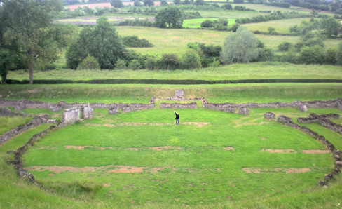 An initial edifice, with rubble foundations, was built in 73-74 CE when a Roman legion arrived. It was replaced by a theater when the legion left the city. A new amphitheater was then built on another site. Built almost entirely in the ground, only the seating located at its far ends were supported by the rubble foundations.