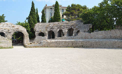 The Cimiez Amphitheater, built to the north of the antique city of Nice, is one of the smallest known amphitheaters in France. Wooden masts for the velarium were supported by corbels on the façade. The seating was accessed from the periphery of the edifice, which is at ground level to the northeast, and through the vomitoriums on the opposite side.