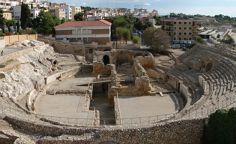The Tarragona Amphitheater overlooks the sea. Part of its cavea is built against the rocky hill, while the other part, which has a hollow structure, is supported by radiating walls. There used to be two levels of arches, but the upper level has disappeared.